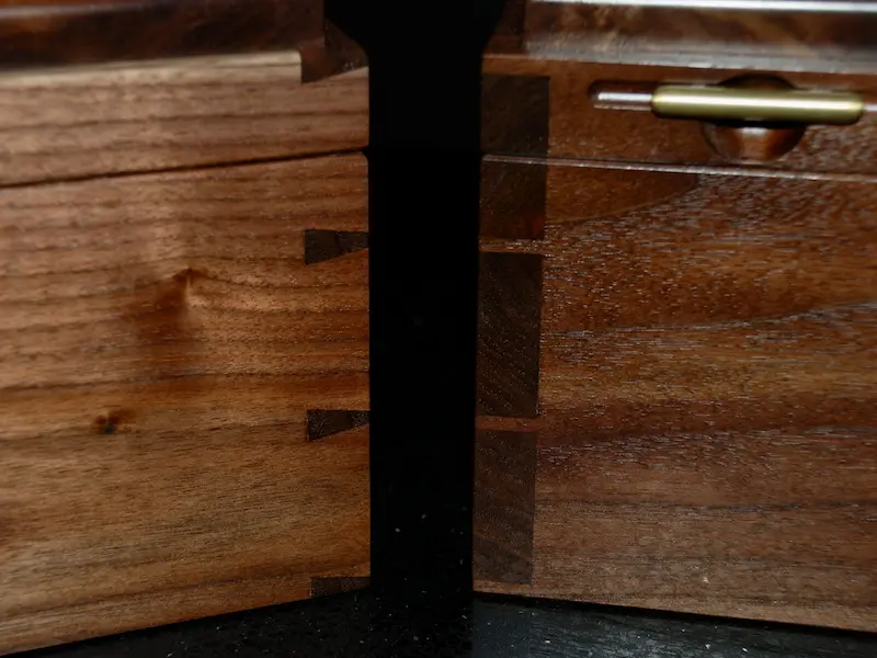 I built every humidor in this collection from the darkest walnut or warm, select cherry. All feature hand-cut dovetail joinery, Spanish cedar interiors, and removable trays with custom dividers. I milled the brass hardware by hand, including the finger pulls, and installed quadrant hinges and analogue hygrometers to finish them off.