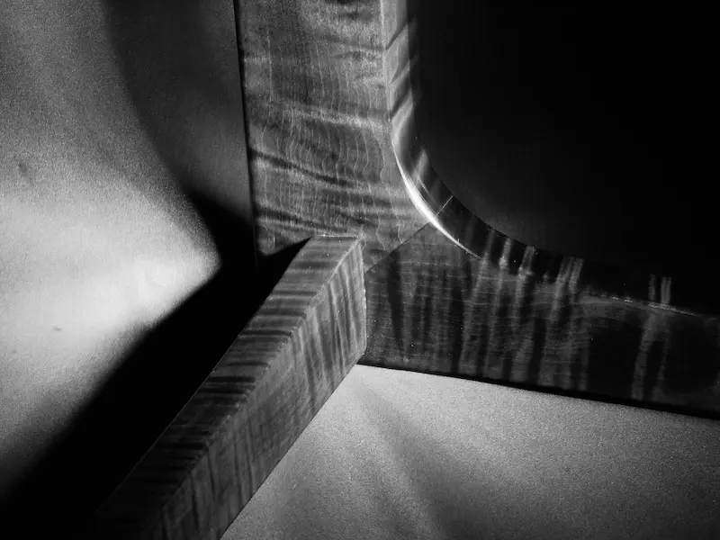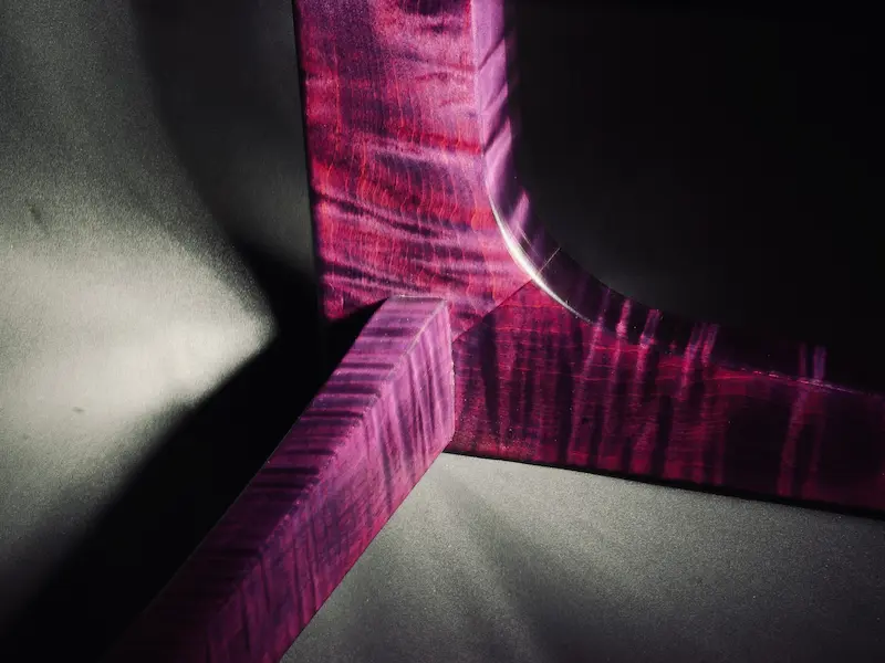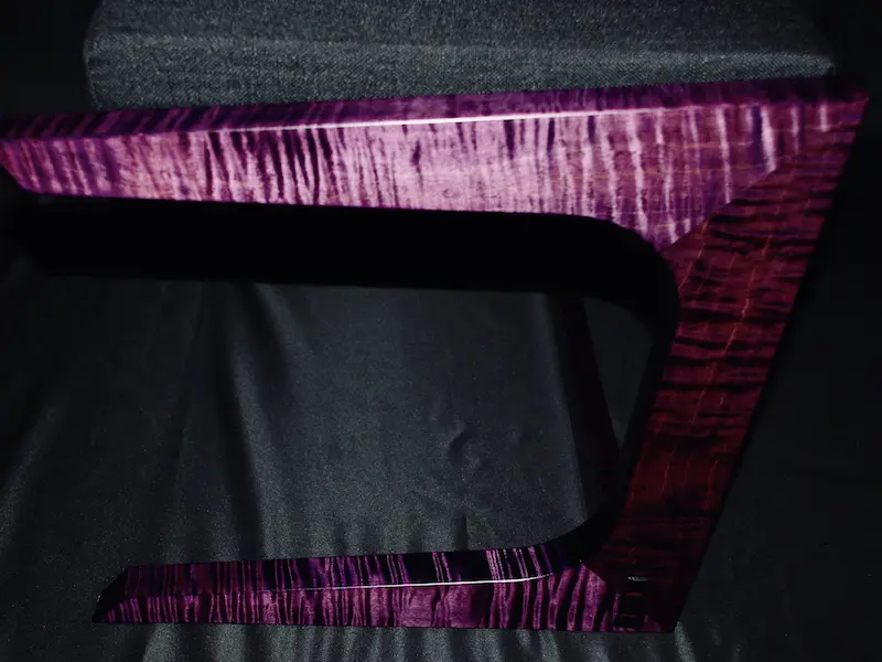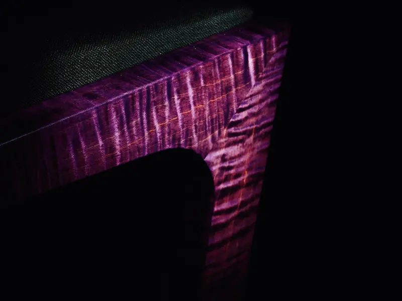 The defining characteristic of this piece is its reactive finish. Using a layered application of Keda dyes, we created a deep, multi-dimensional tone that responds to the environment. In low light, the wood appears nearly black; however, as it catches a direct glow, the chatoyancy of the fiddleback grain reveals a vibrant, electric violet. This isn’t just a surface stain—it is a deeply penetrated color process that highlights the natural movement of the timber while leaning into a bold, custom aesthetic.