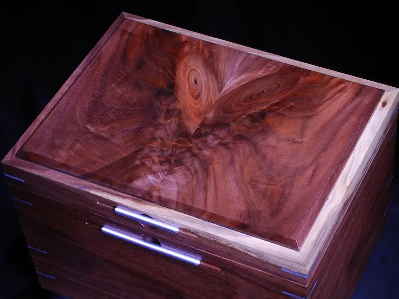 What sets this piece apart is the structural innovation; I utilized a signature aluminum miter spline technique—a rare, modern joinery detail seldom seen in traditional humidor construction. This provides both industrial strength and a striking visual accent that complements the seamless waterfall grain wrap. From the book-matched lid to the hand-rubbed finish, every element of this Made in USA humidor is designed to be a 1-of-1 centerpiece for the discerning enthusiast.